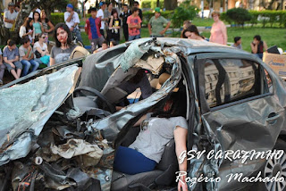 Foi realizado um simulado de acidente de trânsito com 4 vítimas, sendo uma delas presa as ferragens e outra encarcerada, foi utilizado a alavanca de resgate HI LiFT, alavanca de fenda e o desecarcerador hidráulico para abertura e corte das ferragens.