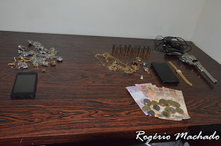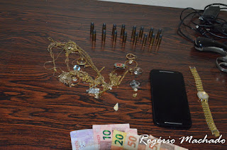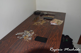 Com ele foram encontrados joias e semi joais, um valor em dinheiro(R$ 145,00), dois smatphones e um revolver Smith& Wesson, calibre 32 e 15 munições intactas.