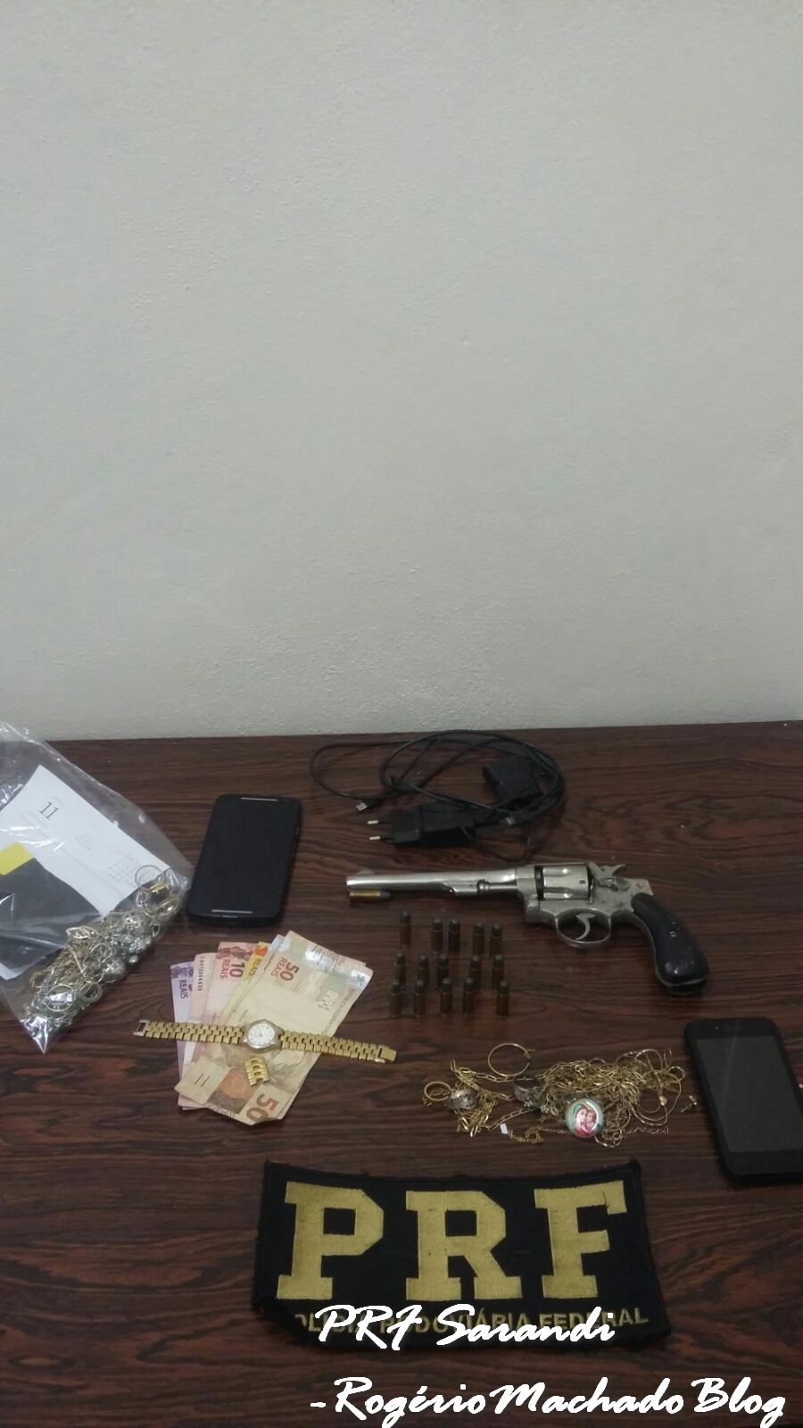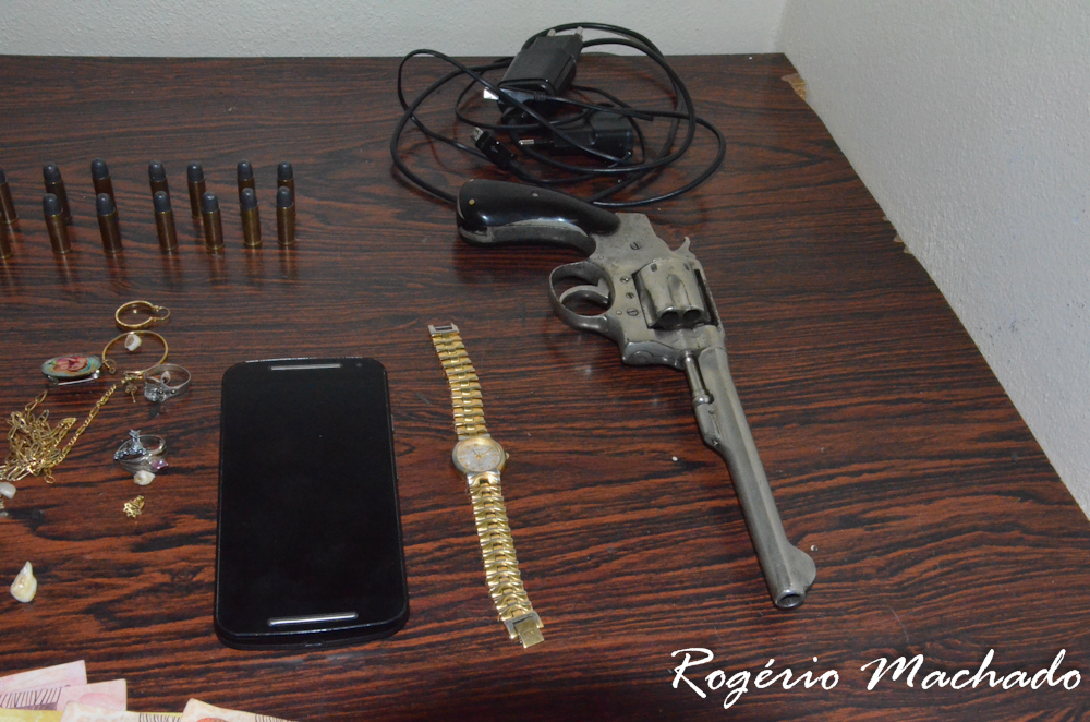 Com ele foram encontrados joias e semi joais, um valor em dinheiro(R$ 145,00), dois smatphones e um revolver Smith& Wesson, calibre 32 e 15 munições intactas.