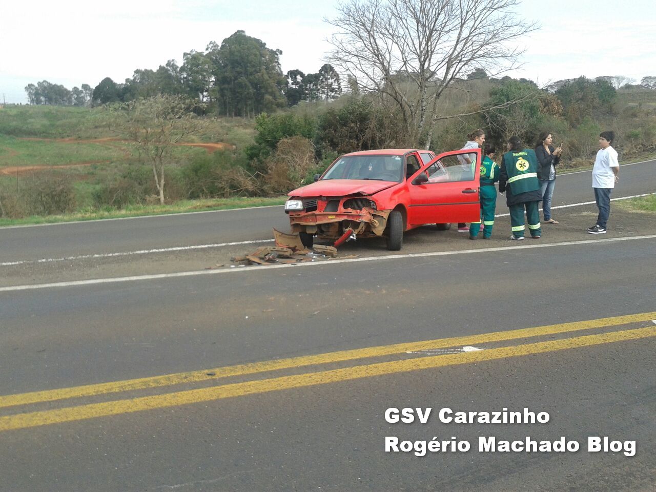 Caminhão placas ATX4522 de Cascavel PR ocupado por José Pedro dos Santos 42 vinha sentido carazinho soledade, No gol placas MCW 7423 condutora Lucivane Wesp 22, na carona Tassiana de Março 38 e seu filho Bruno de Marco 11 anos, vinham sentido Erechim carazinho ambos os veículos danos materiais.